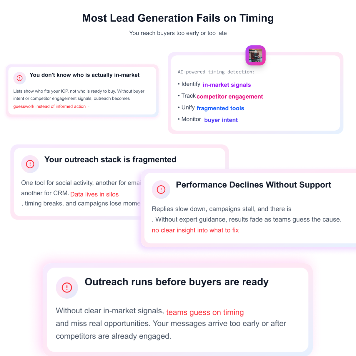 Outreach runs before buyers are ready or after competitors are already engaged. Without clear in-market signals, teams guess on timing and miss real opportunities.