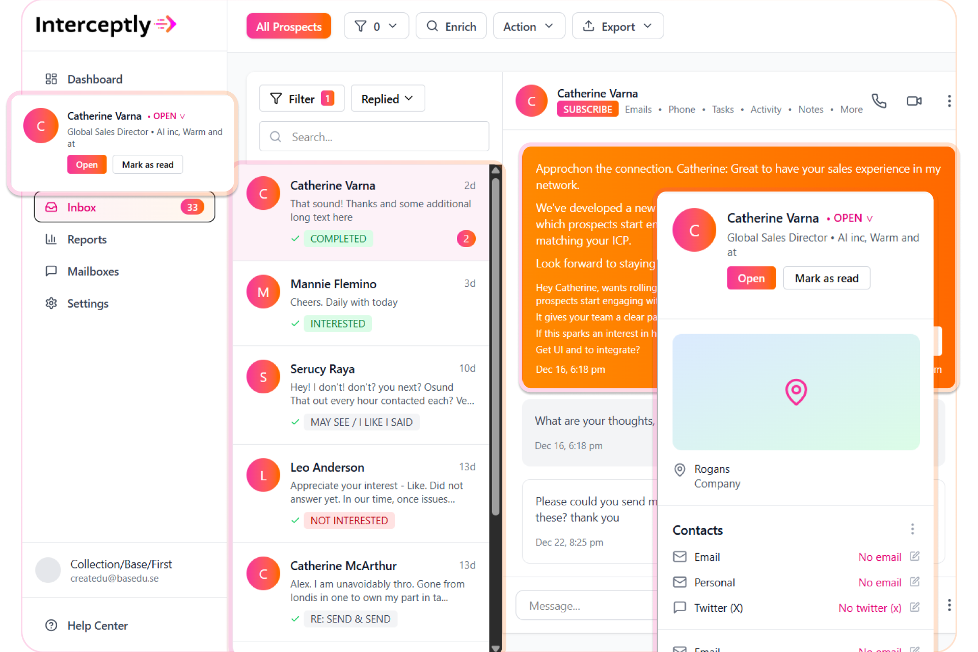 Interceptly supports email, social, and phone outreach, using AI-powered messaging and intent data. Channels can run independently or together, giving you control over how and where outreach happens.