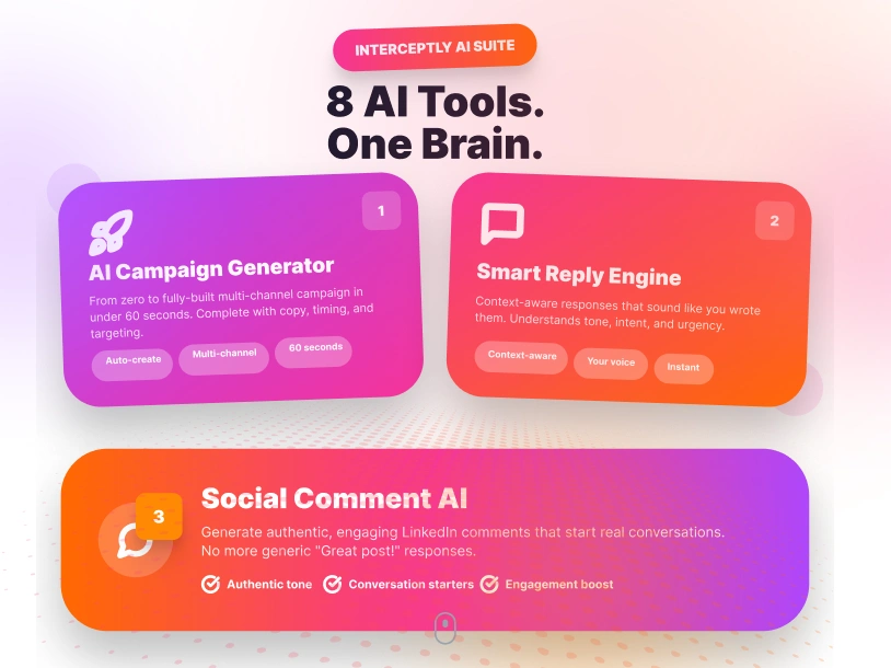 Interceptly offers 8 integrated AI tools, including AI-generated campaigns, smart replies, post comments, and inbox tagging. Expandi provides sequence automation with personalization tokens.