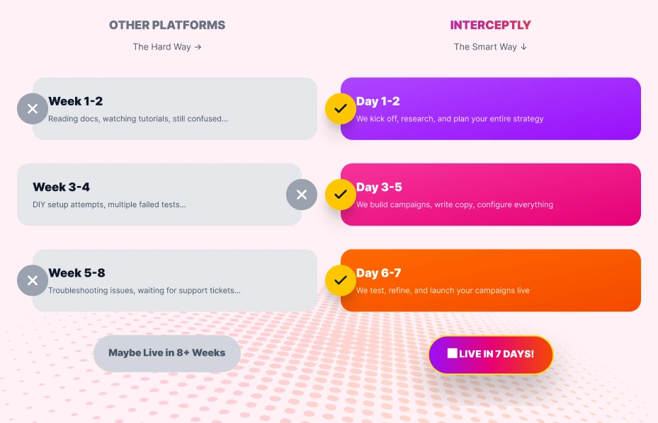 Most teams go live within days. With Pipeline Builderâ„¢, our team handles campaign setup so you can start seeing results quickly.
