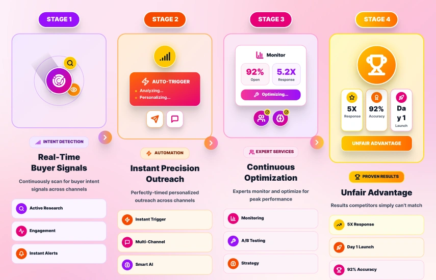 Beyond reliable automation, Interceptly’s proprietary buyer intent tracking helps you reach prospects at precisely the right moment, while expert services ensure your campaigns perform from day one.
