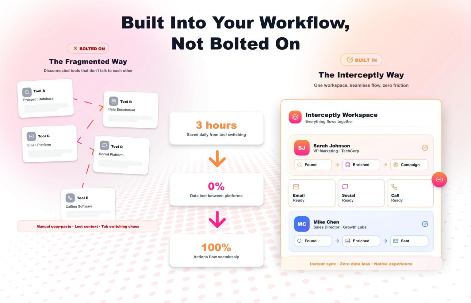 The contact data platform is part of the Interceptly platform, not a separate system you export from and manage elsewhere. Prospecting, enrichment, and outreach all happen in one place.Â