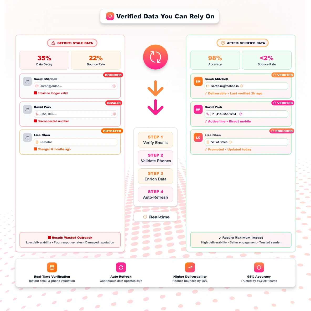 Many contact databases rely on static lists that quickly become outdated. Teams export data, start outreach, and find emails bounce, or phone numbers no longer reach the right person. That wastes time and slows prospecting.Â