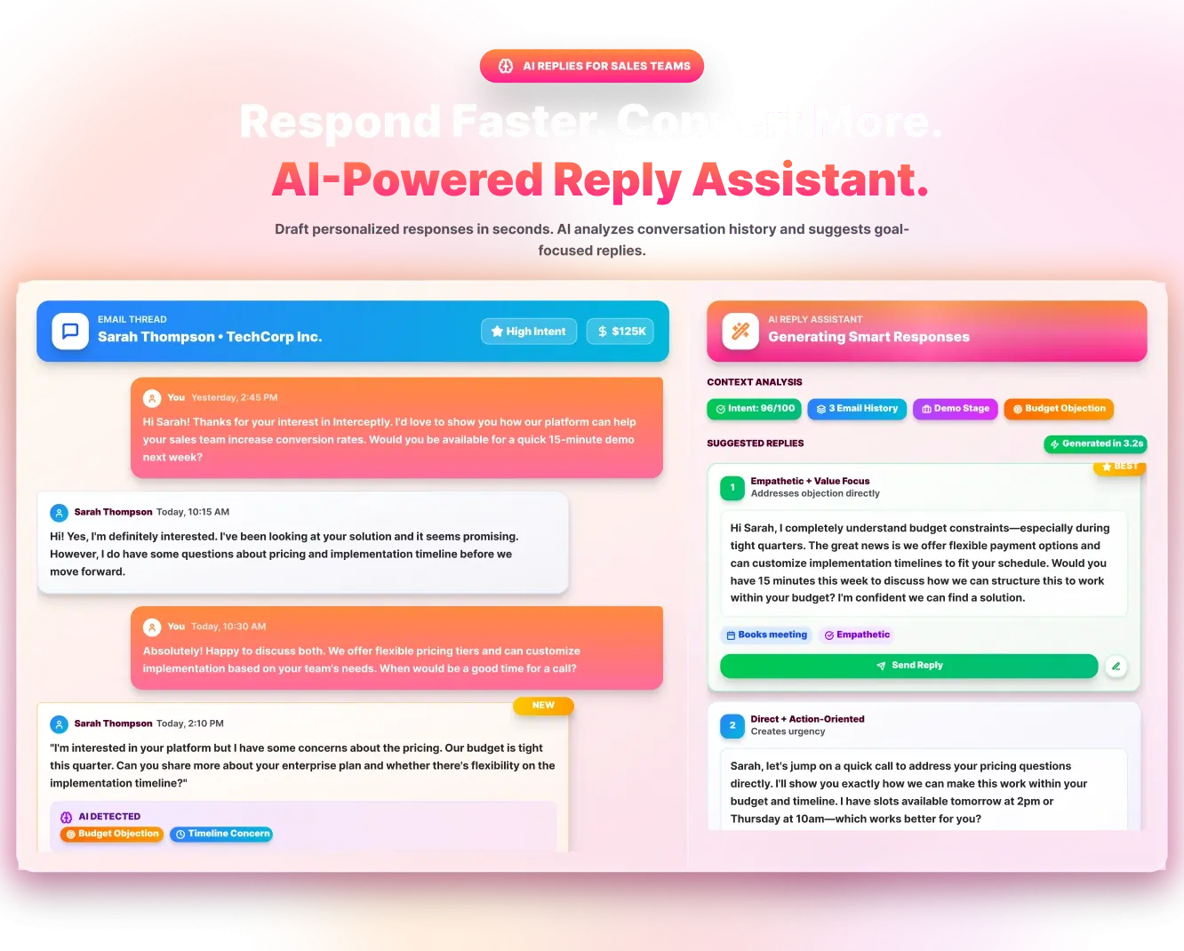 Yes. AI replies analyze pricing concerns, timing questions, and competitor mentions inside conversations. Interceptly drafts structured responses that address objections clearly and guide prospects toward next steps. Sales teams save time while improving reply quality and increasing meeting conversion opportunities.