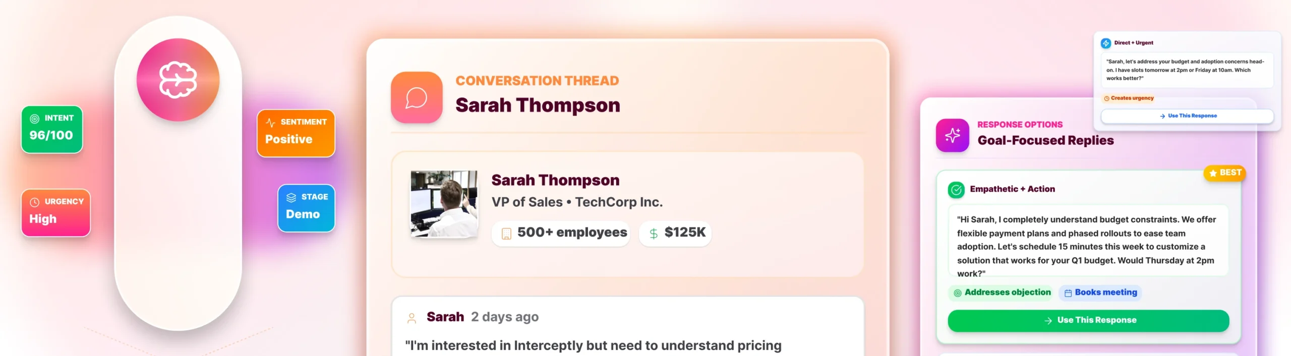 AI replies help sales teams respond faster and more consistently. Quick responses increase engagement and reduce drop-off in active conversations. By suggesting goal-focused replies that move toward scheduling, Interceptly turns more engaged prospects into booked meetings and an active pipeline.