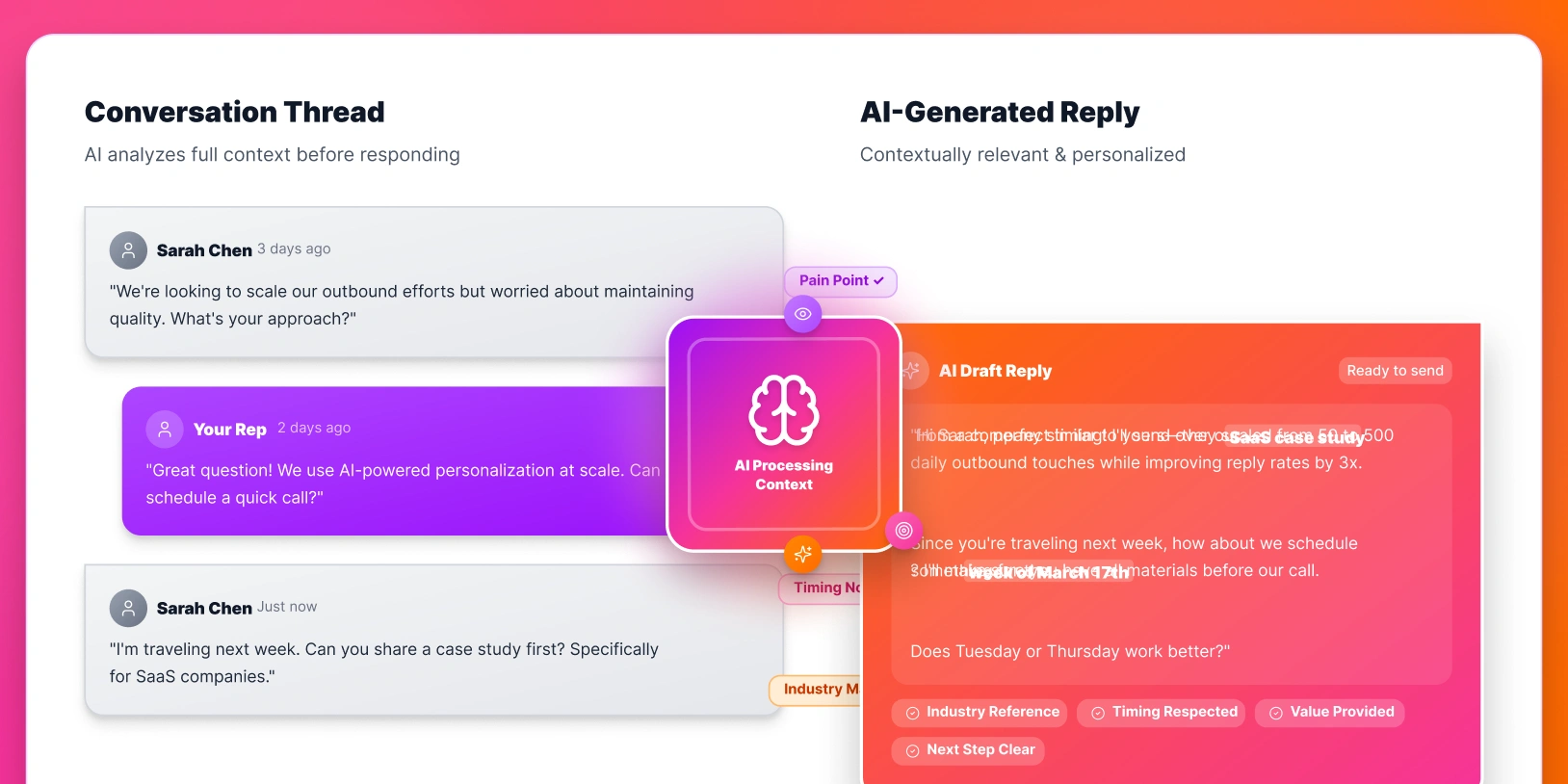 The AI reply assistant analyzes each message thread and the prospect’s context to generate AI suggested replies directly in your sales inbox.
