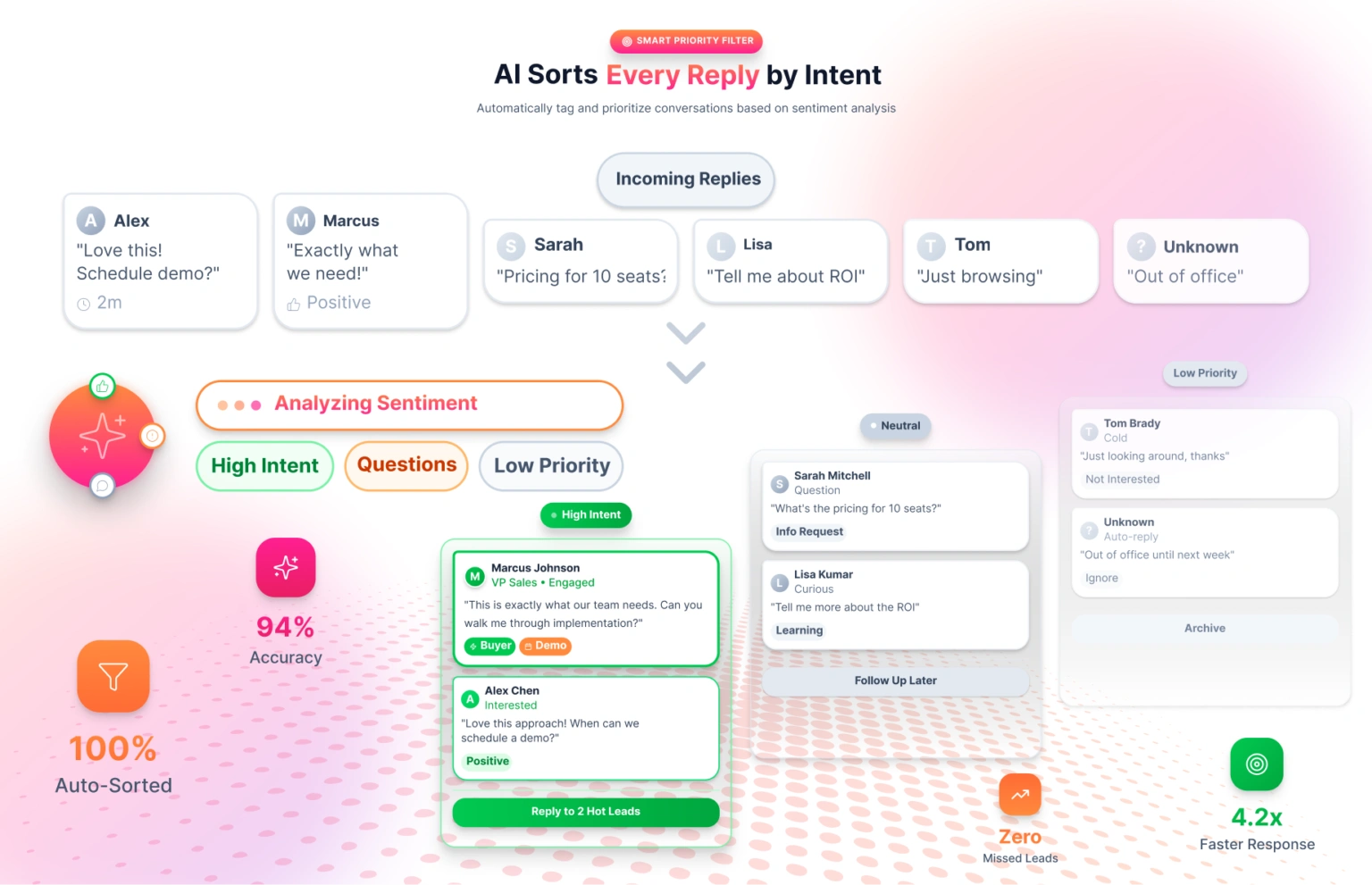 AI inbox tagging helps sales teams know who to focus on first. Interceptly analyzes reply sentiment to identify interest, neutral responses, and low intent conversations. The platform automatically tags and surfaces engaged prospects, so teams spend time on buyers who want to talk, respond faster, and prioritize conversations most likely to convert.