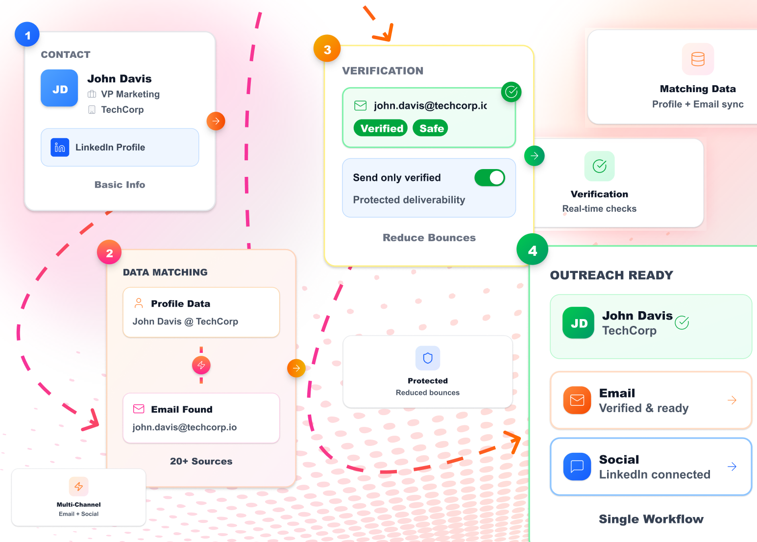 Email verification settings let you choose to send only to verified addresses. Using verified emails reduces bounces, protects deliverability, and supports multi-channel campaigns that combine social and email outreach from a single workflow.