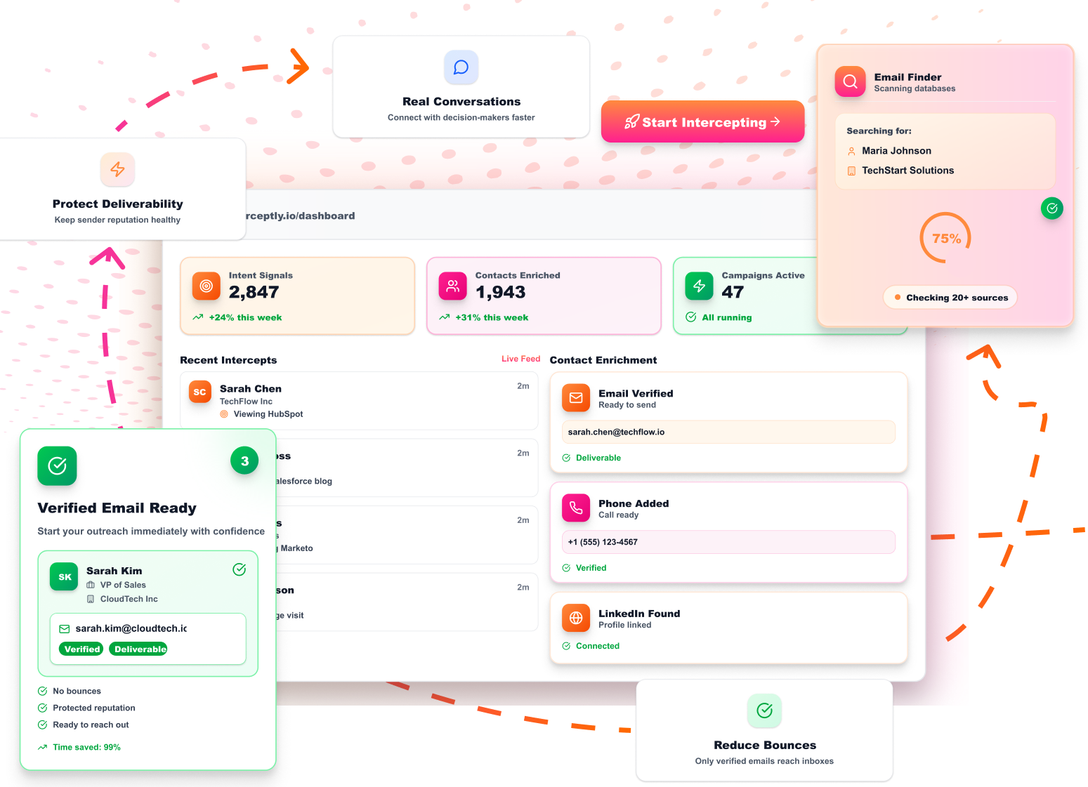 You identify the right prospect, then spend time finding a working email address. Interceptly’s email finder tool helps you find verified business emails quickly. Verified emails reduce guesswork, limit bounces, protect deliverability, and help sales teams focus on starting conversations instead of chasing contact details.