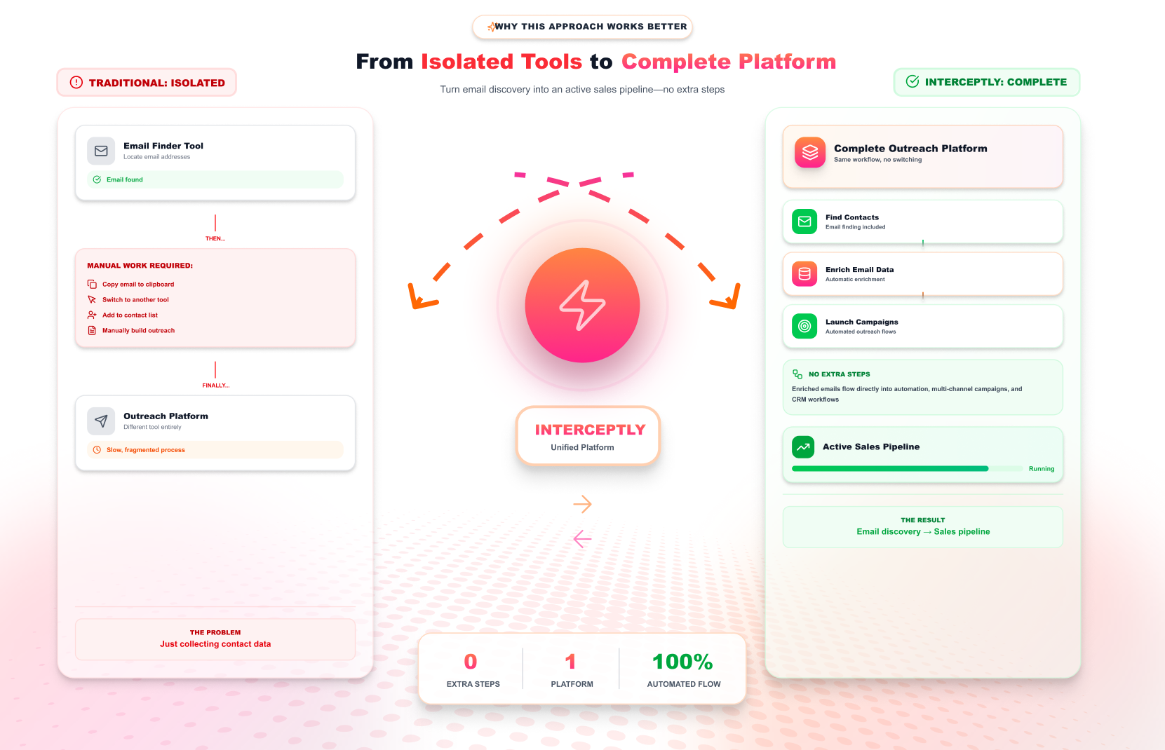 Interceptly includes email finding inside a complete outreach platform. Find contacts, enrich email data, and launch automated campaigns from the same workflow. Enriched emails flow directly into email automation, multi-channel campaigns, and CRM workflows without extra steps.