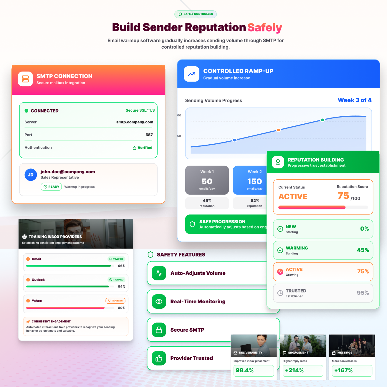 Email warmup software gradually increases sending volume when you connect your mailbox through SMTP. This controlled ramp-up builds sender reputation and establishes healthy sending behavior.