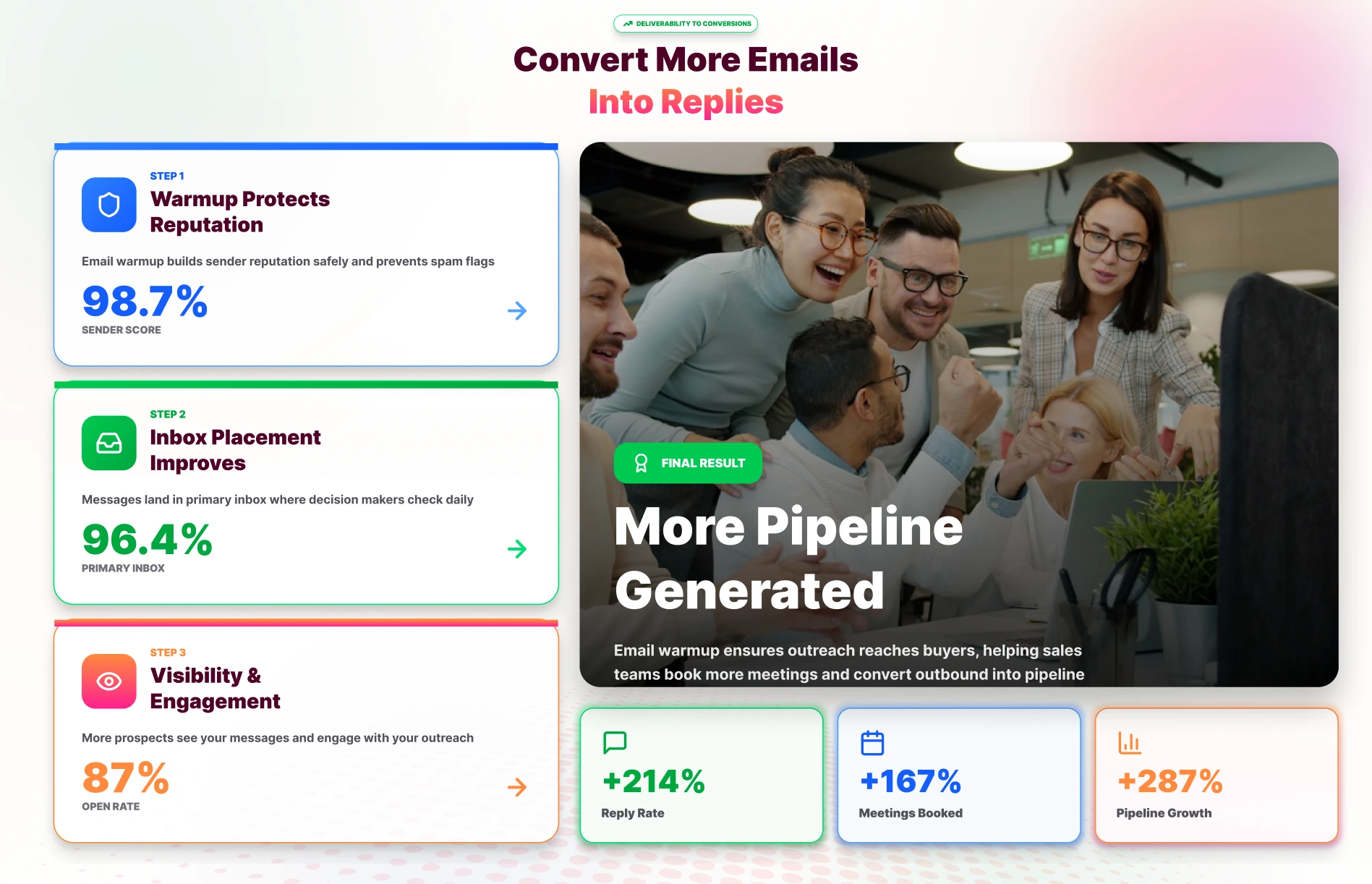 Email warmup software ensures your outreach reaches buyers, helping sales teams book more meetings and convert outbound into pipeline.