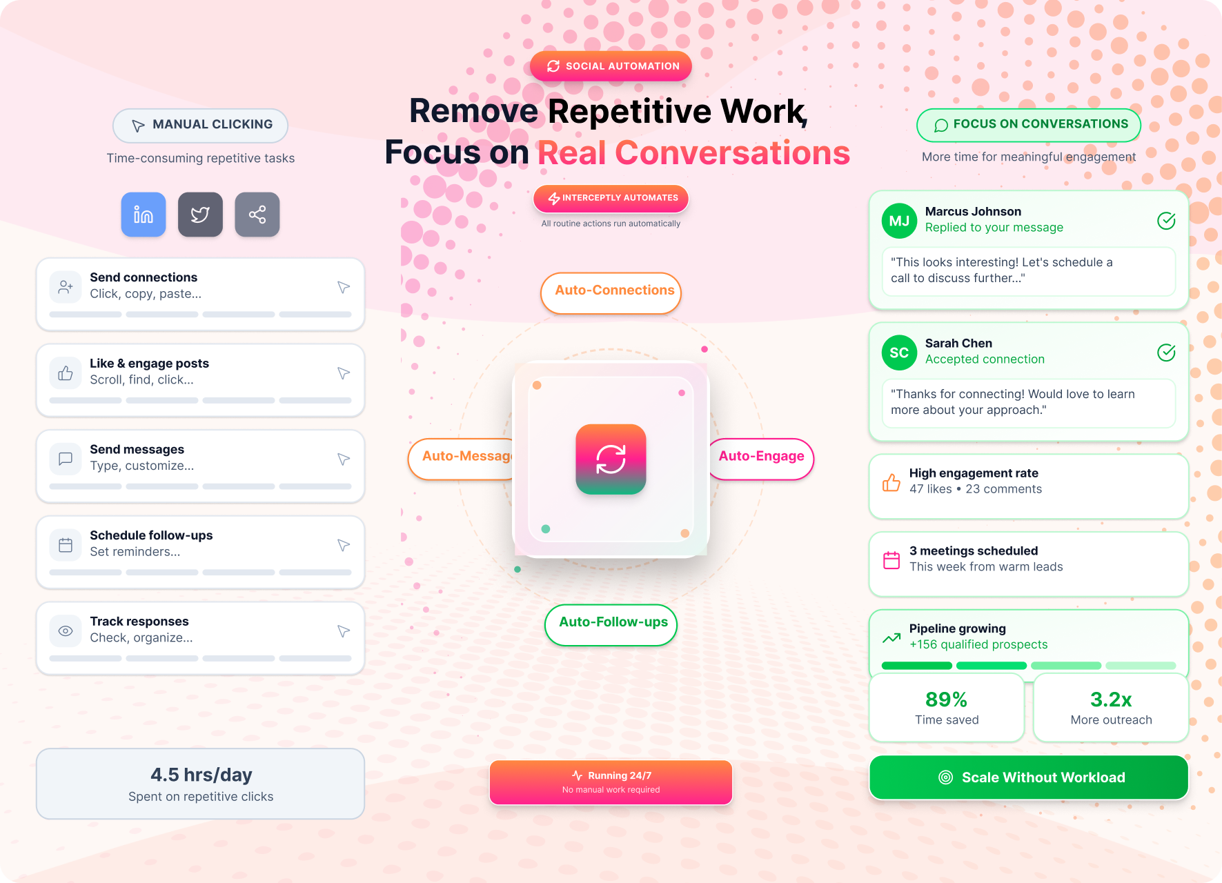 Social automation removes repetitive manual work from daily prospecting. Interceptly automates routine actions like outreach steps and follow-ups, so sales teams spend less time clicking and more time engaging prospects. This helps teams move faster, stay consistent, and scale social outreach without adding workload or losing focus on real conversations.
