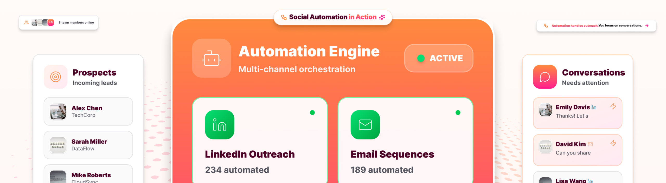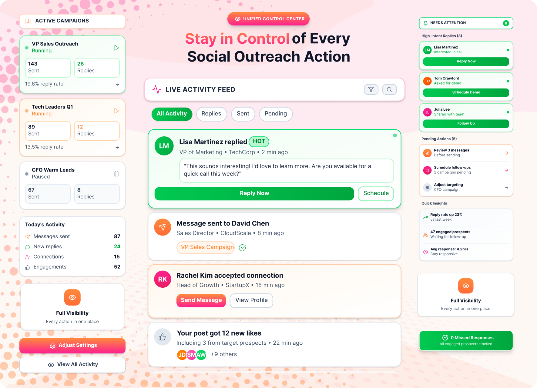Teams can automate repetitive actions, review outreach before it runs, and step in when personal input matters. This reduces manual effort, keeps activities organized, and helps sales teams focus on meaningful conversations rather than switching between tools or managing routine social tasks.