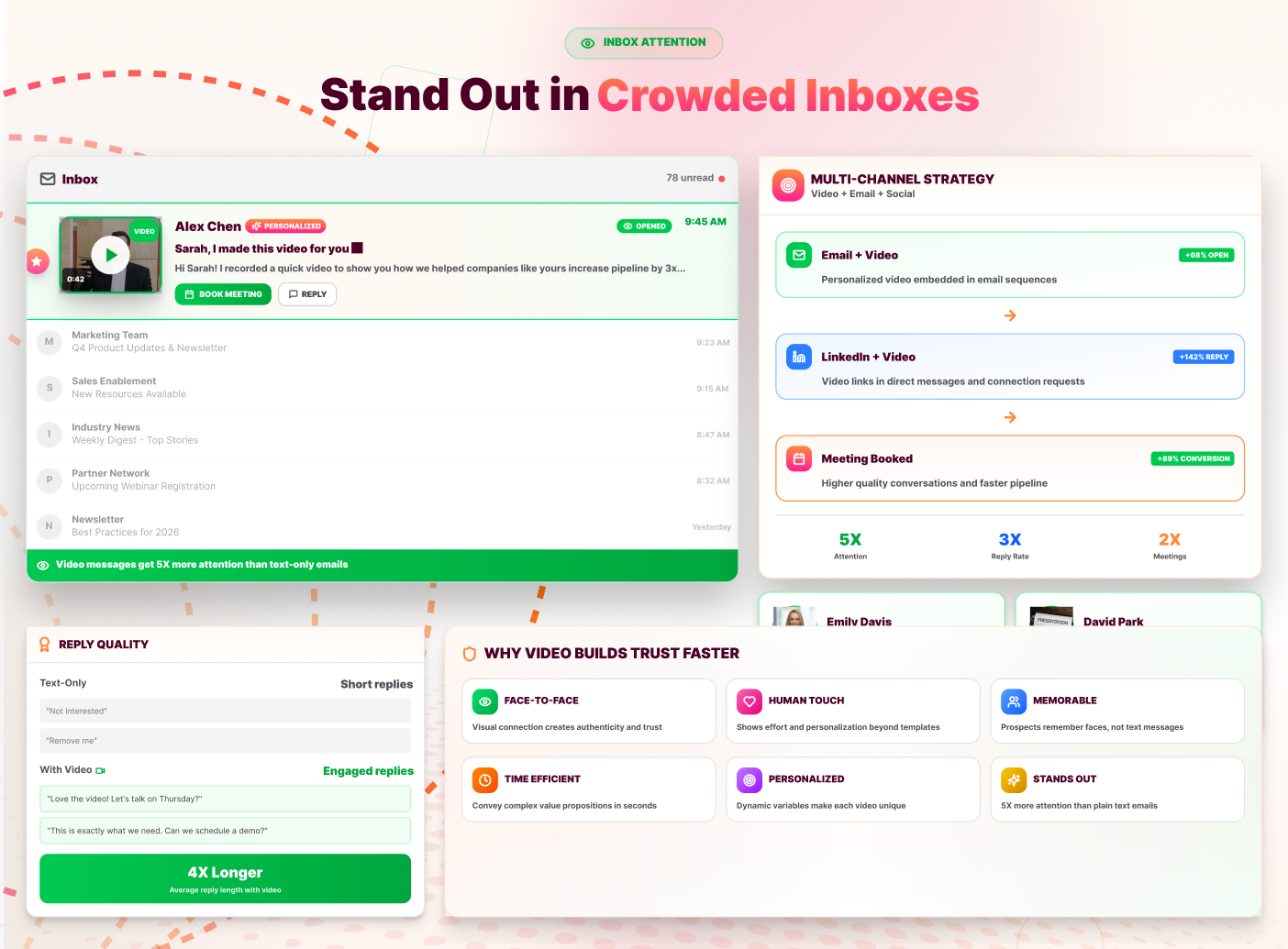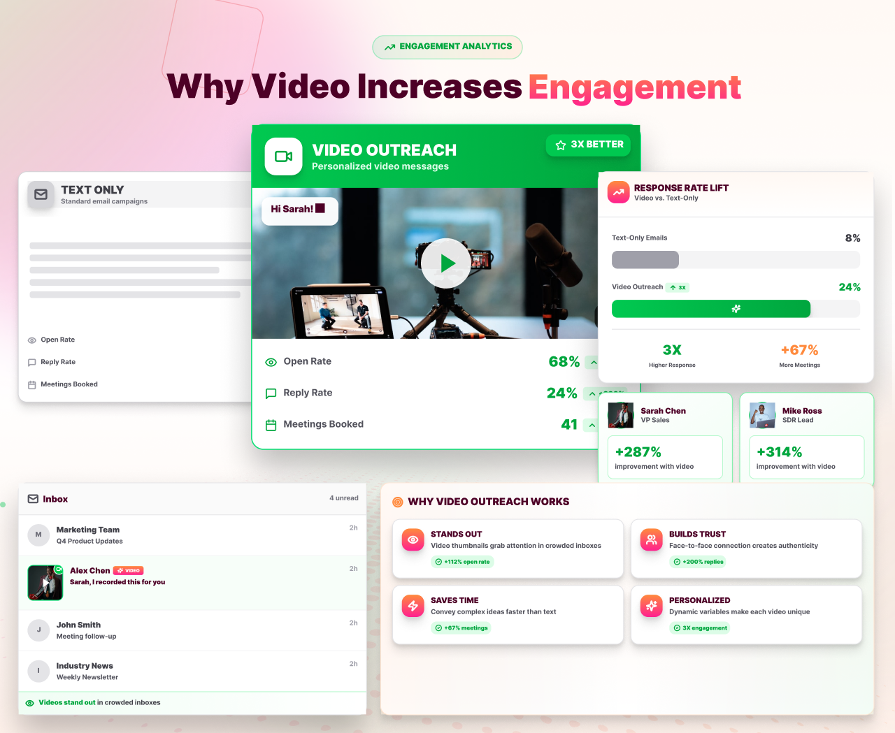 Sales Teams can see response rates increase by up to 3x compared to text-only outreach, helping book more meetings without adding work.