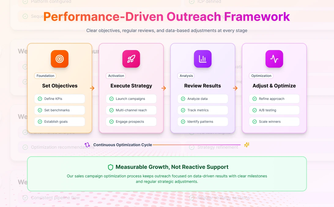 We set clear objectives, review results regularly, and adjust strategy based on data. This sales campaign optimization process keeps outreach campaign management focused on measurable growth, not reactive support.