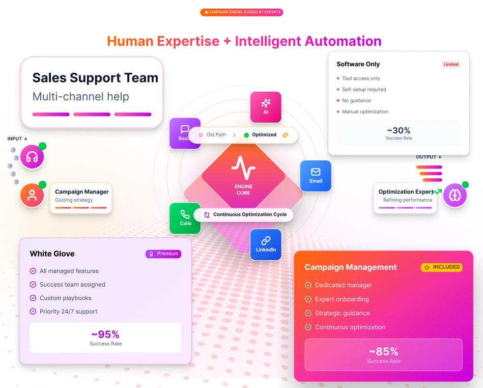 Work with a dedicated campaign manager and proactive sales support team to launch faster, optimize continuously, and turn outreach activity into consistent pipeline and measurable revenue growth.