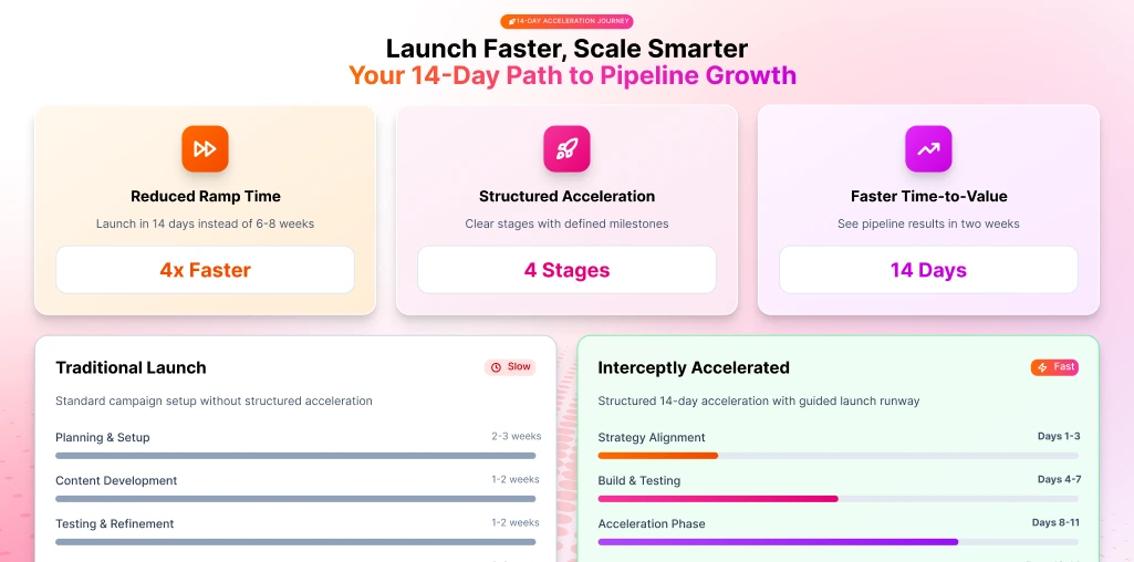 Interceptly accelerates managed lead generation with a structured 14-day launch process where applicable. We align strategy early, define targeting clearly, and build campaigns with performance in mind.