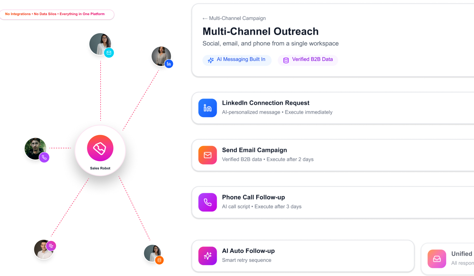Multi-channel outreach across social, email, and phone runs from a single workspace, with AI messaging and verified B2B data built in. No integrations to maintain. No data silos. Campaigns flow into a unified inbox, where AI messaging supports personalization, follow-ups, and lead prioritization so that teams can focus on real conversations.